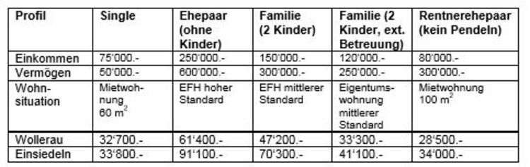 Das Verfügbare Einkommen pro Jahr für Wollerau und Einsiedeln nach Familienprofilen (Modellhaushalte mit Pendeln in nähere Zentren) ist wie folgt: